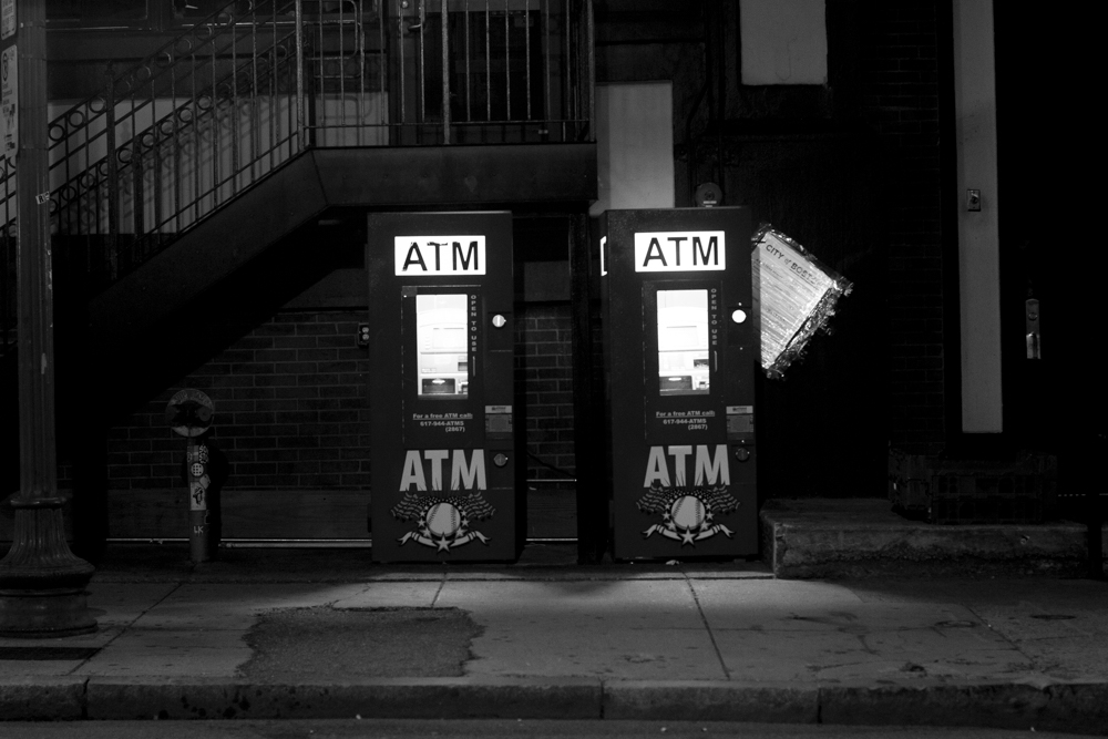 Two ATMs stand together on a quiet night in Fenway on June 7th