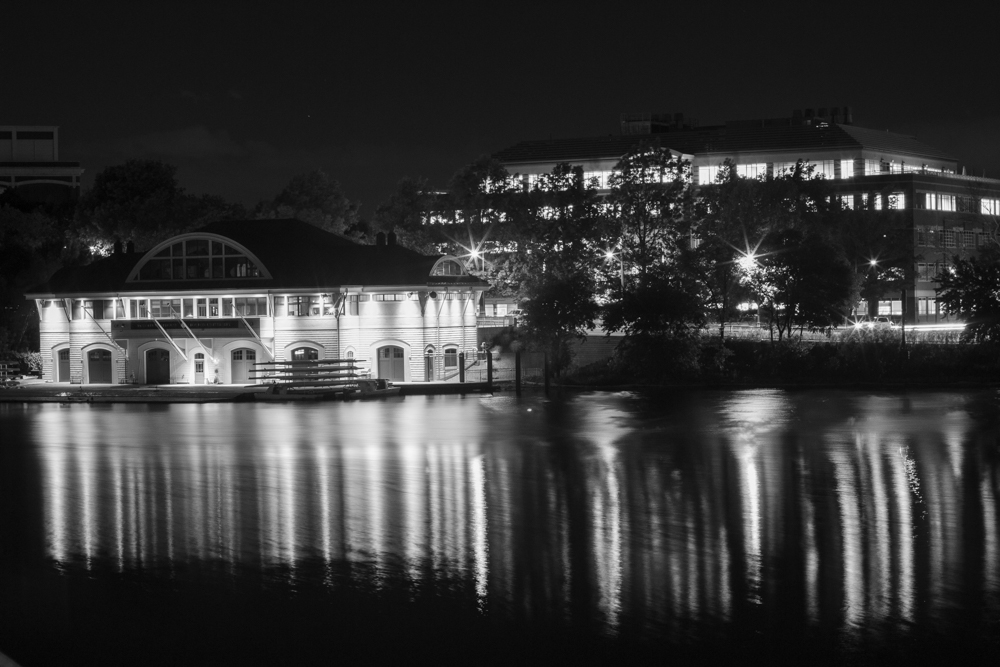 The BU Boathouse with its reflection on the water of the Charles River in Boston on a quiet night on June 7th